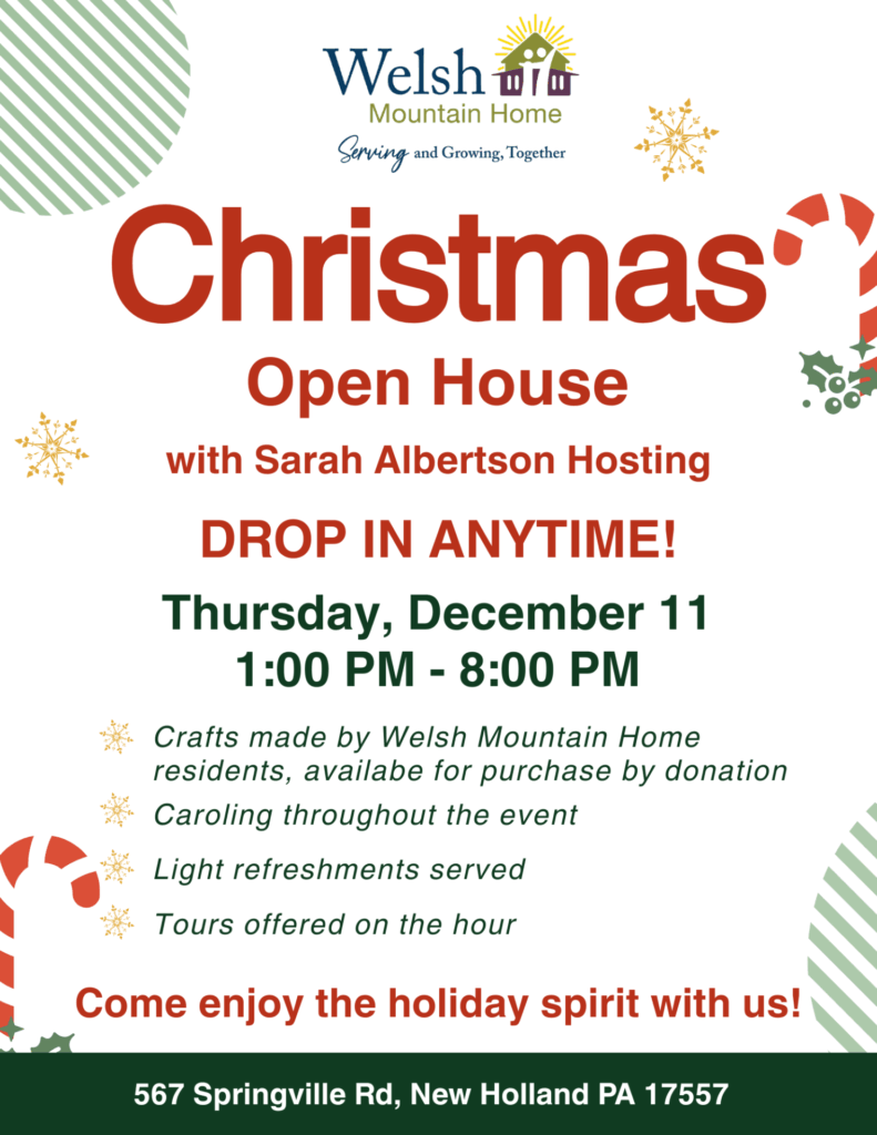 Guests are invited to stop by anytime during the day to enjoy festive activities and holiday cheer. Visitors can browse and purchase resident-made crafts by donation, listen to caroling throughout the afternoon and evening, and enjoy light refreshments. Tours of Welsh Mountain Home will also be offered on the hour, providing an opportunity to see the community and meet staff and residents.